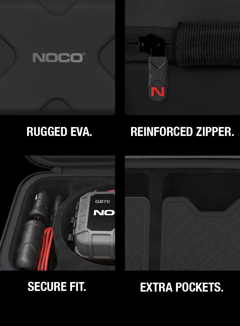 The lightweight, durable, and rugged GBC014 EVA Protective Case has a semi-rigid custom exterior with zipper closures and a reinforced handle. The rubberized EVA exterior offers protection from moisture, impact, dust, and other environmental factors, while the molded interior perfectly fits, stores, and protects its corresponding NOCO Boost UltraSafe jump starter— the GB70 Boost HD (sold separately).