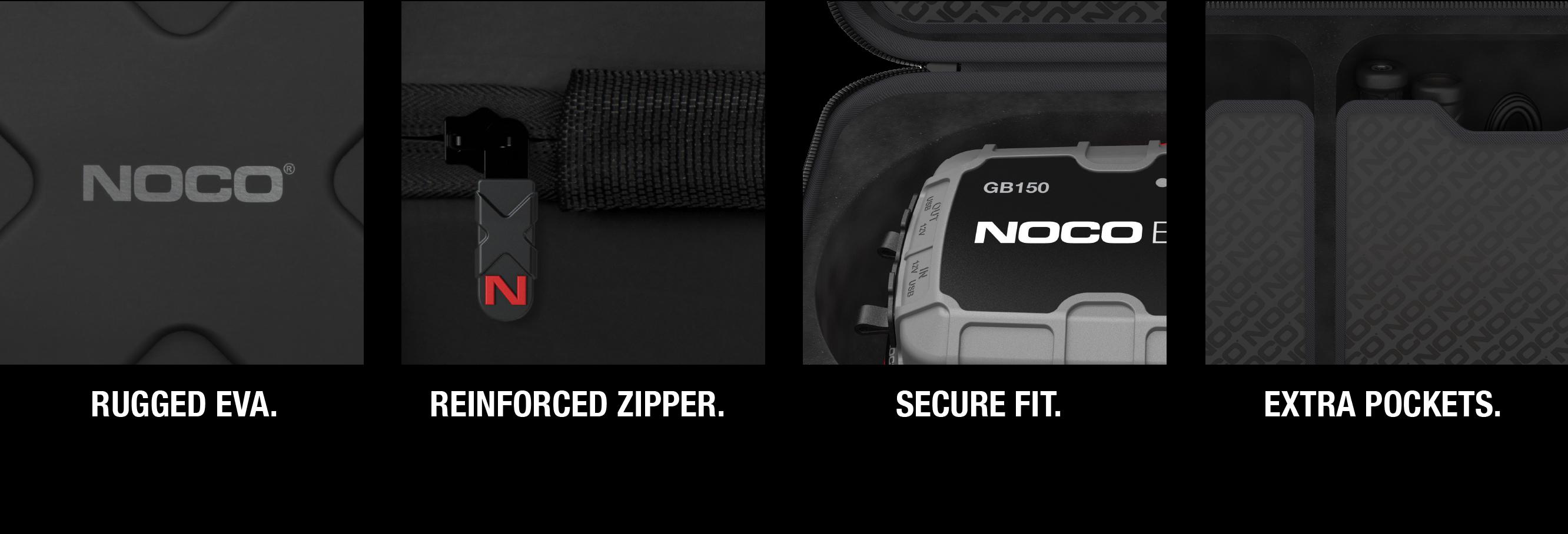 The lightweight, durable, and rugged GBC015 EVA Protective Case has a semi-rigid custom exterior with zipper closures and a reinforced handle. The rubberized EVA exterior offers protection from moisture, impact, dust, and other environmental factors, while the molded interior perfectly fits, stores, and protects its corresponding NOCO Boost UltraSafe jump starter— the GB150 (sold separately).