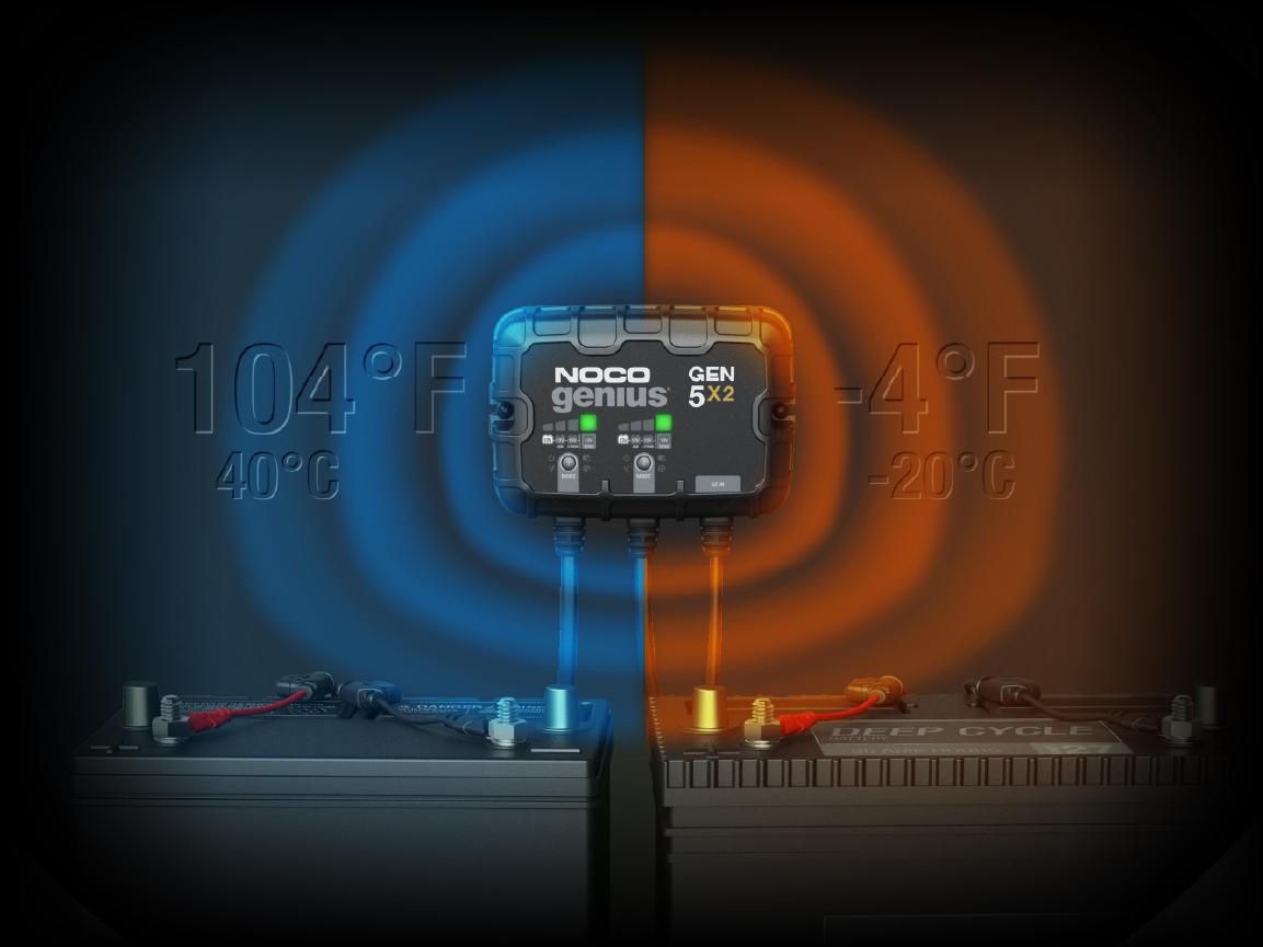The new integrated thermal sensor automatically monitors and adjusts the charging cycle based on fluctuations of ambient temperature, limiting the chance of under-charging or over-charging, providing a more accurate and fully charged battery. Avoids under-charging in cold weather down to -4F and avoids over-charging in hot weather up to 104F.