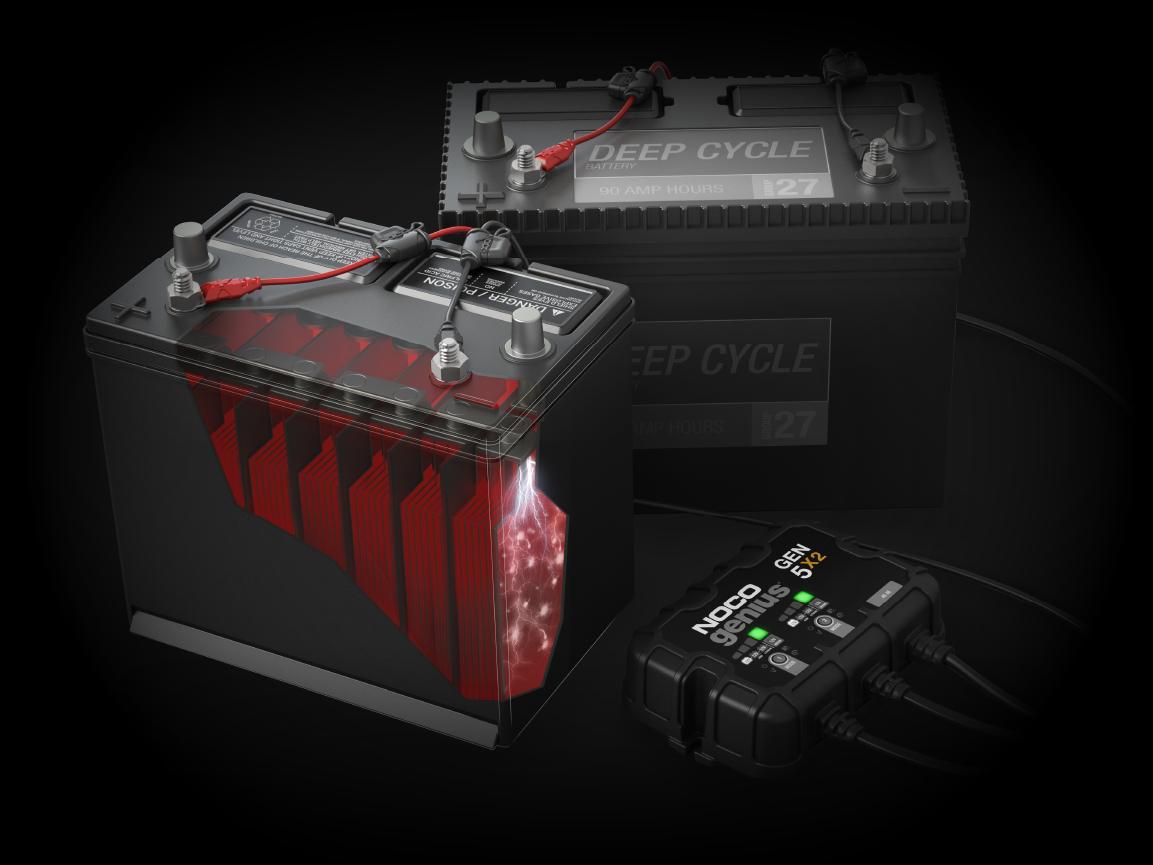 Meet the all-new GEN5X2. Similar to our GENM2, only better. It's 27% smaller and delivers 43% more power. It's one of the best performing onboard marine battery chargers we have ever made. A two-bank onboard battery charger rated at 10-amps (5-amps per bank) for 12-volt batteries, including marine, boat, starter, and deep-cycle batteries. Independently charge and control each battery bank with selectable charging modes - including 12V, 12V AGM, 12V Lithium, and 12V Repair Mode - for all types of lead-acid and lithium-ion batteries.