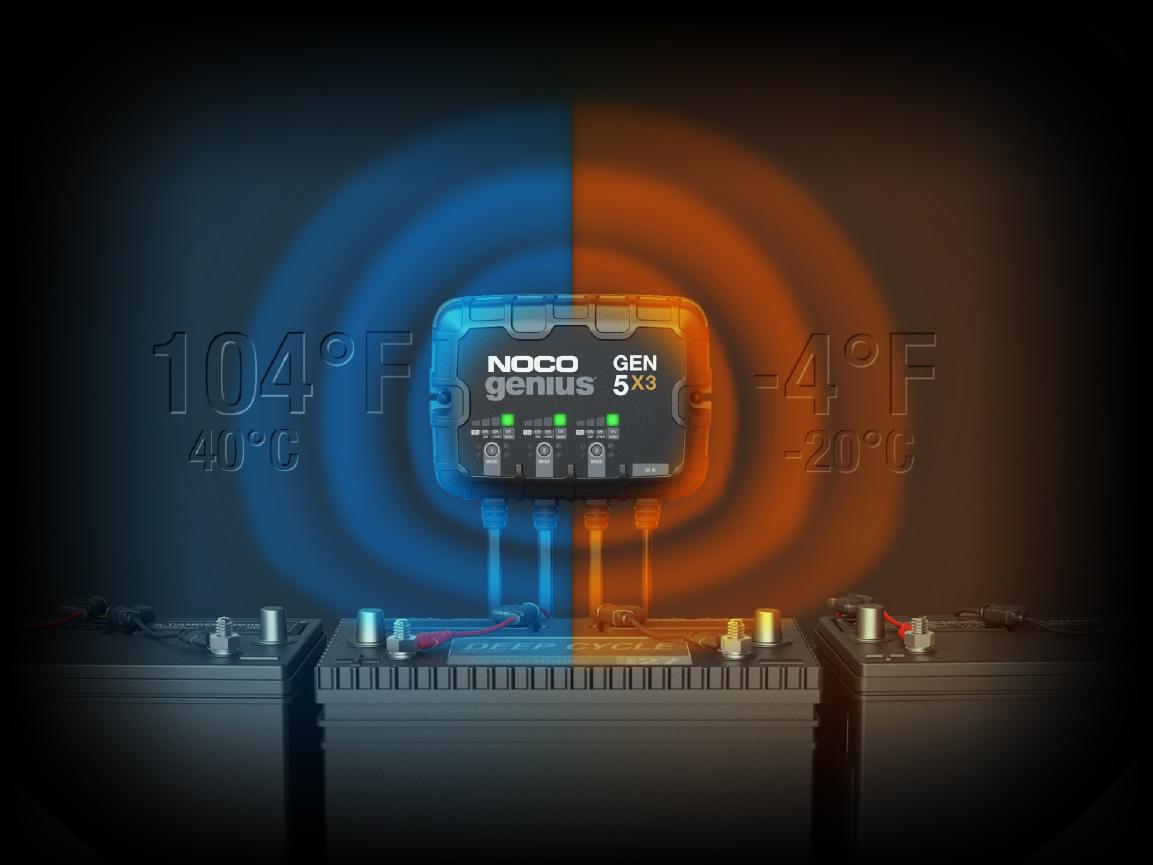 The new integrated thermal sensor automatically monitors and adjusts the charging cycle based on fluctuations of ambient temperature, limiting the chance of under-charging or over-charging, providing a more accurate and fully charged battery. Avoids under-charging in cold weather down to -4F and avoids over-charging in hot weather up to 104F.