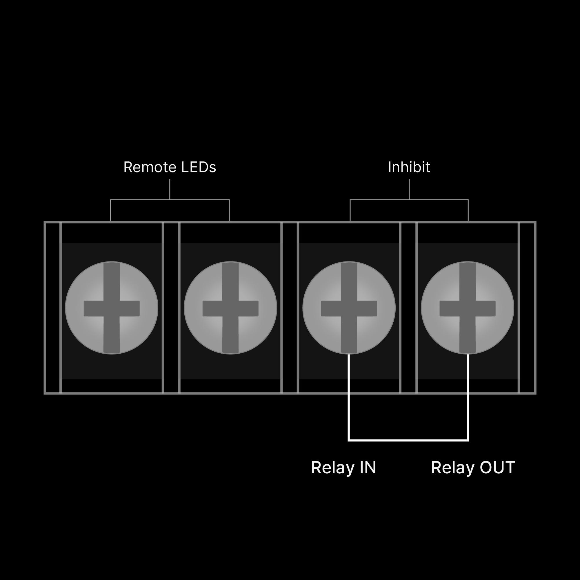 Each screw represents one side of the relay. When the relay is closed, it is as though the two screws (Inhibit Port) are connected together with a wire. When this is the case, you do not have to worry about polarity in connecting with the Inhibit Port.