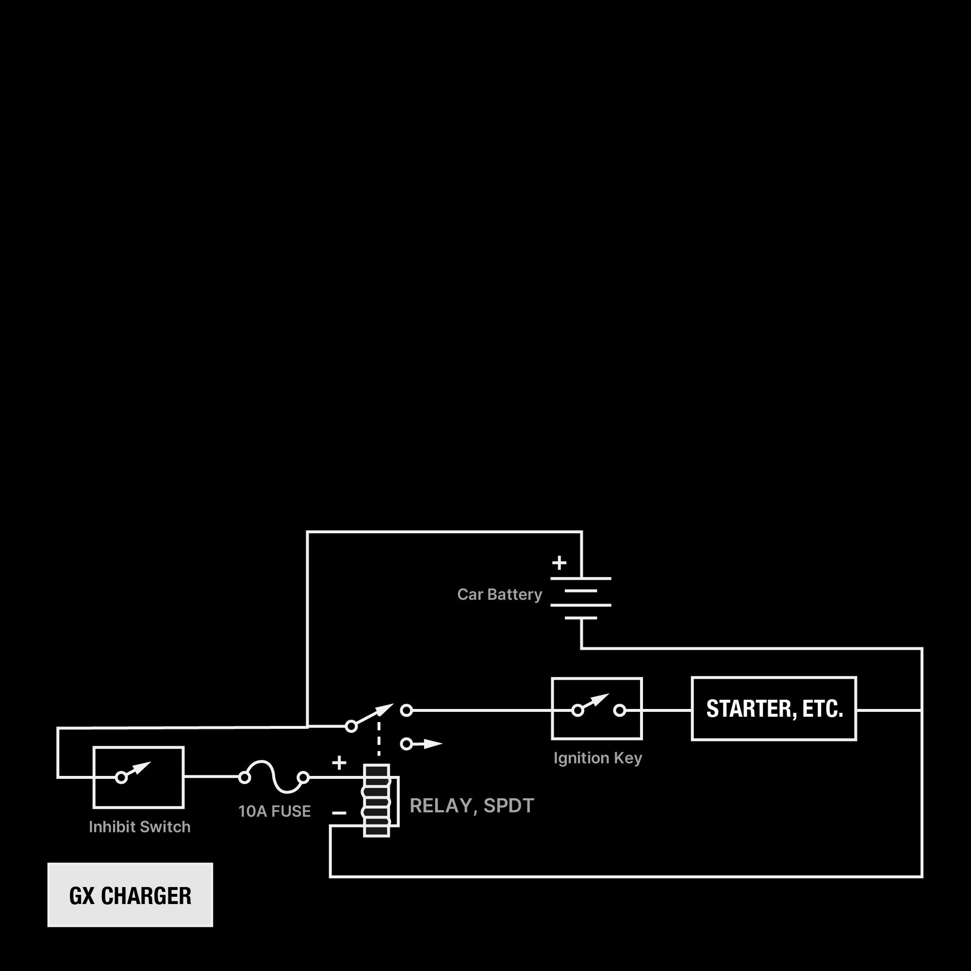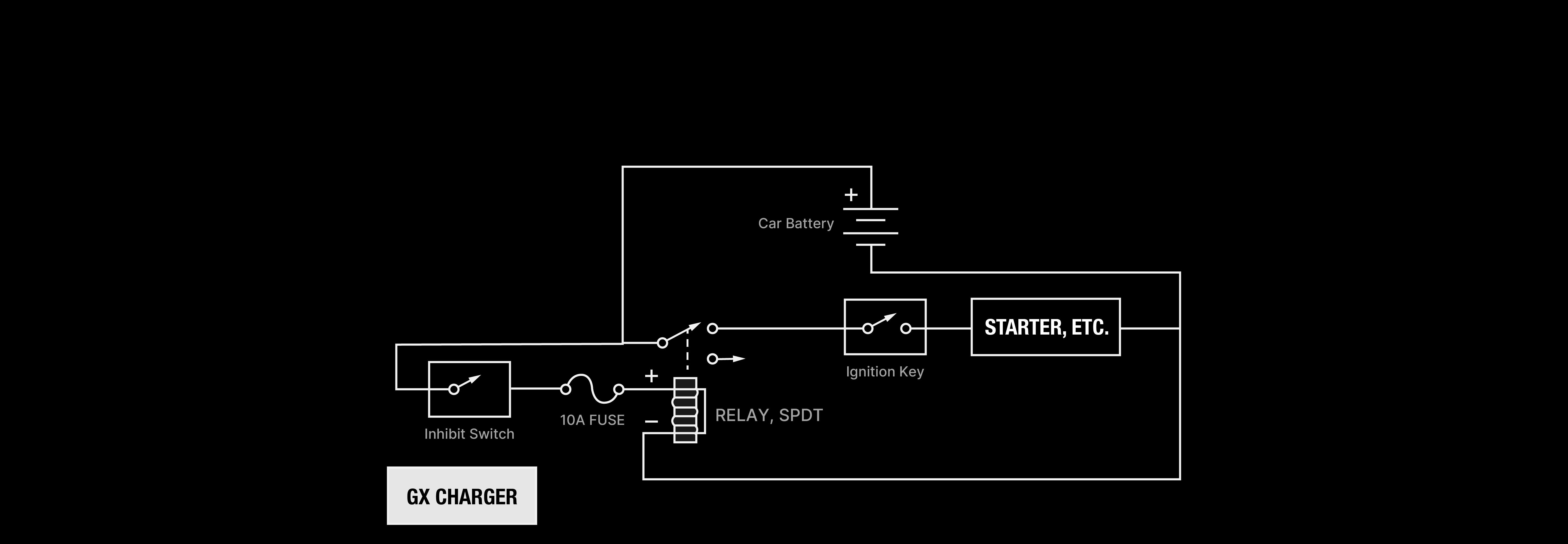 The inhibit feature prevents electric vehicles from moving while charging, which prevents accidental damage to the connected cabling system. The inhibit port contains a 20A relay that closes when connected to AC power and disables the vehicle. When the charger is removed from AC power, it takes approximately 20 seconds for the capacitors to discharge and the relay to open.