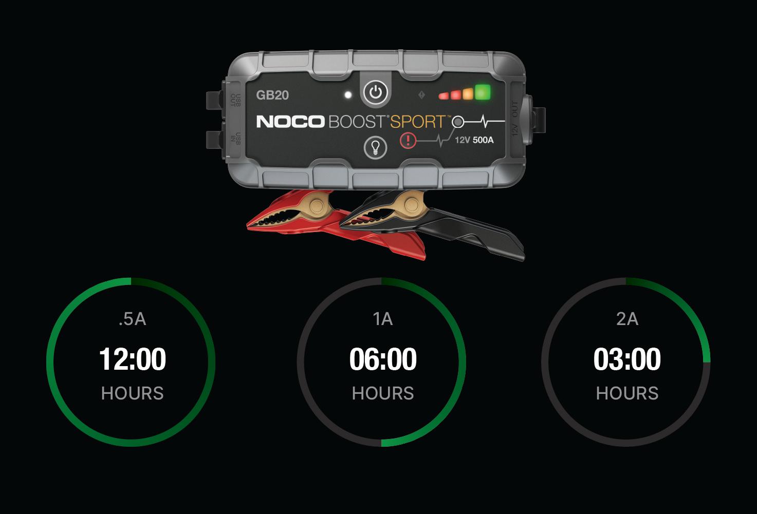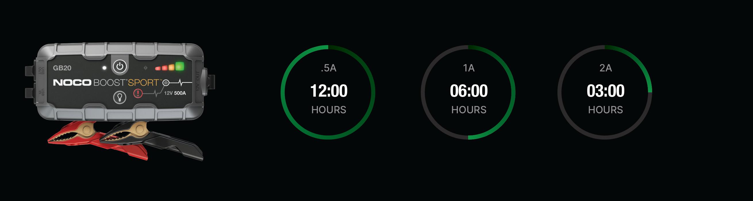 Connect the GB20 using the included USB Charge Cable to the USB IN port and the USB car charger. It can also be recharged from any USB powered port, like an AC adapter, car charger, laptop and more. The USB IN port is rated at 2.1 Amps to ensure safe and efficient charging of the internal lithium battery. Due to FCC regulations, we recommend not to charge and discharge the unit at the same time. The time to recharge a GB20 will differ based on the discharge level and the power source used. Actual results may vary due to battery conditions.