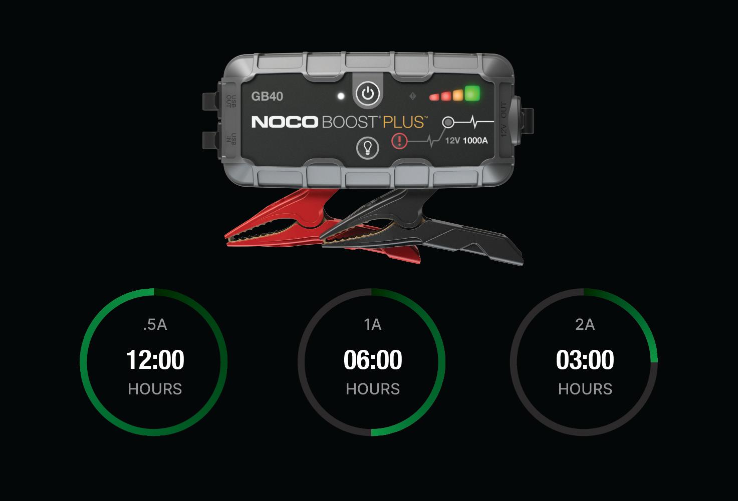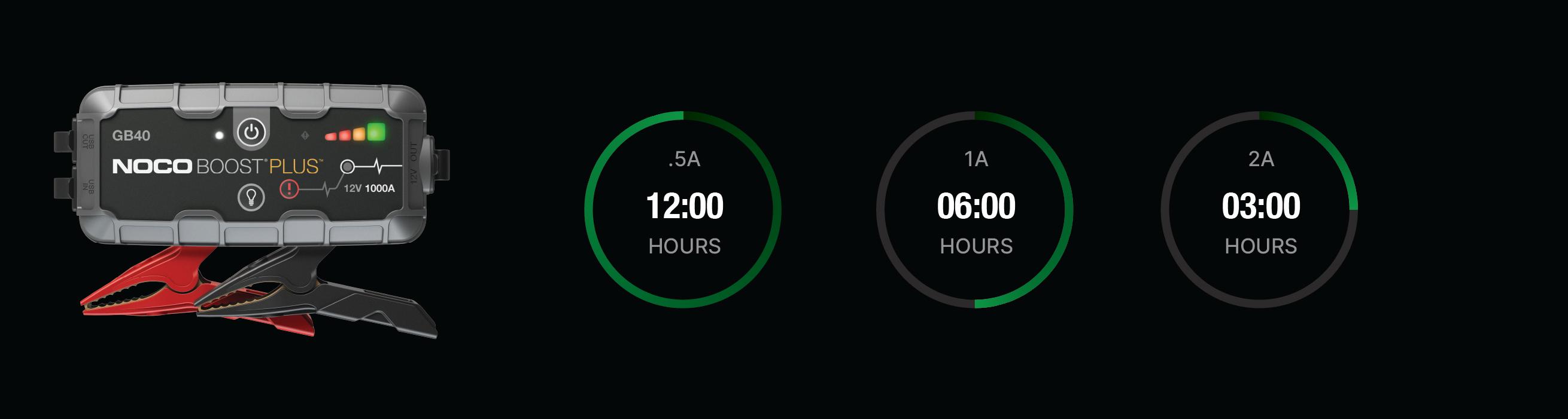 Connect the GB40 using the included USB Charge Cable to the USB IN port and the USB car charger. It can also be recharged from any USB powered port, like an AC adapter, car charger, laptop and more. The USB IN port is rated at 2.1 Amps to ensure safe and efficient charging of the internal lithium battery. Due to FCC regulations, we recommend not to charge and discharge the unit at the same time.The time to recharge a GB40 will differ based on the discharge level and the power source used. Actual results may vary due to battery conditions.