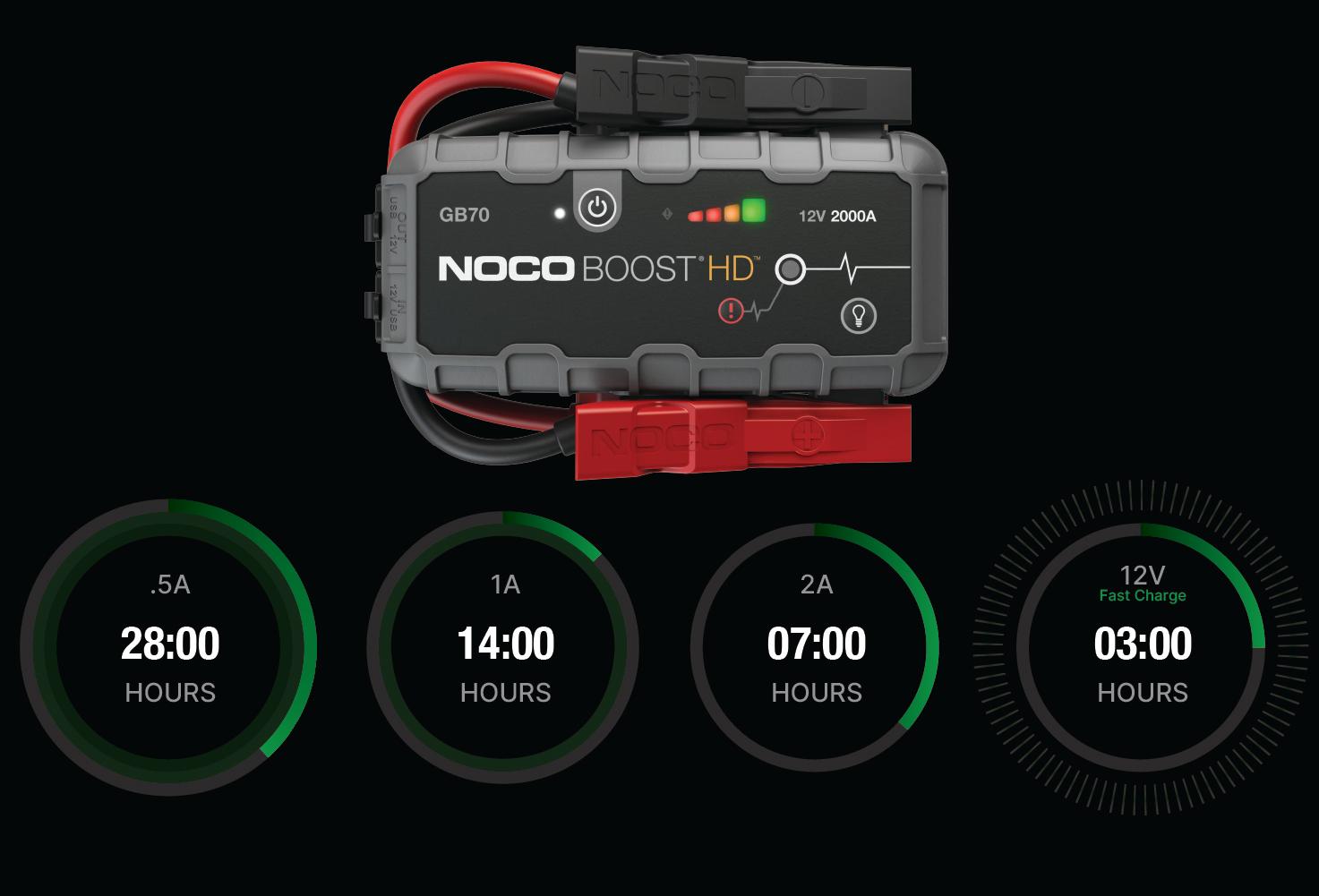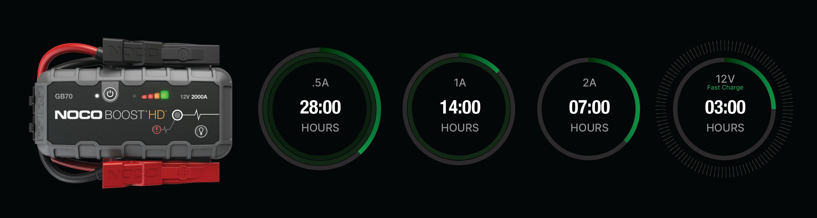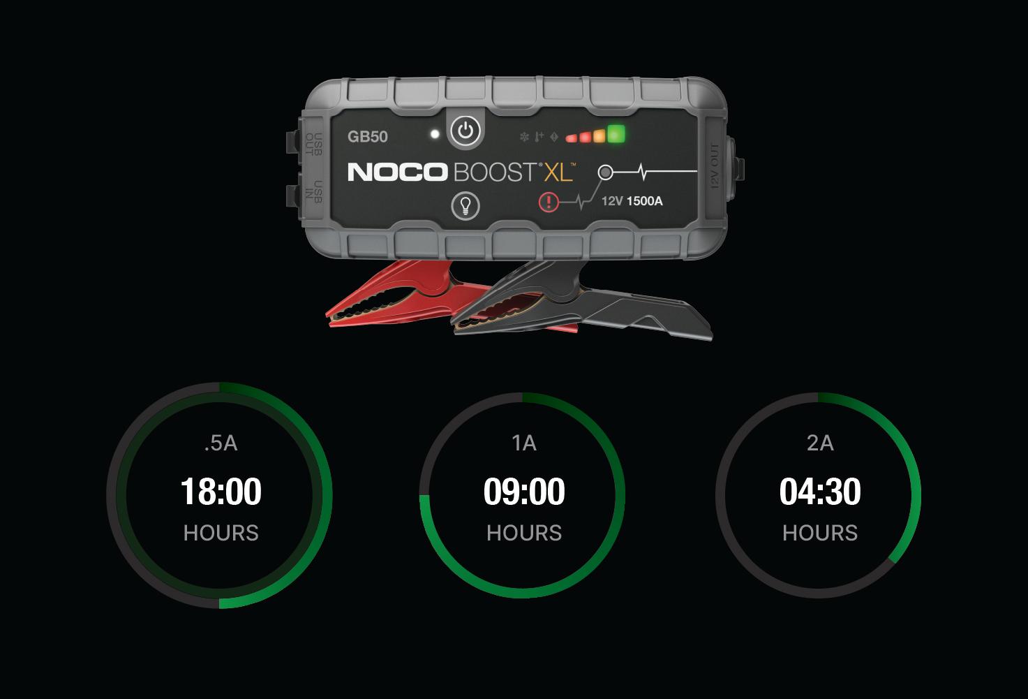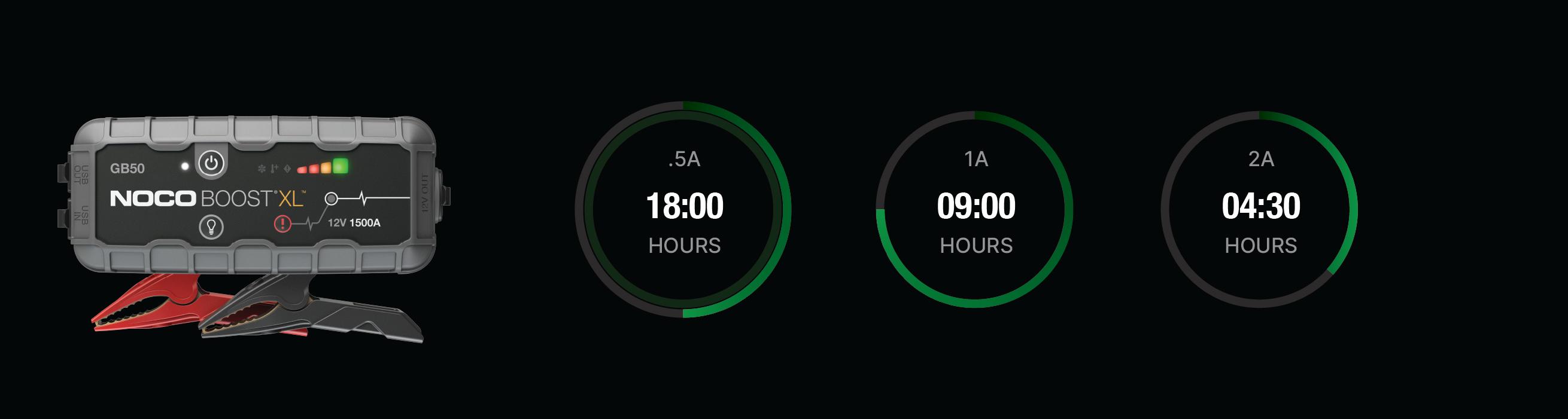 Connect the GB50 using the included USB Charge Cable to the USB IN port and the USB car charger. It can also be recharged from any USB powered port, like an AC adapter, car charger, laptop and more. The USB IN port is rated at 2.1 Amps to ensure safe and efficient charging of the internal lithium battery. Due to FCC regulations, we recommend not to charge and discharge the unit at the same time.The time to recharge a GB50 will differ based on the discharge level and the power source used. Actual results may vary due to battery conditions.