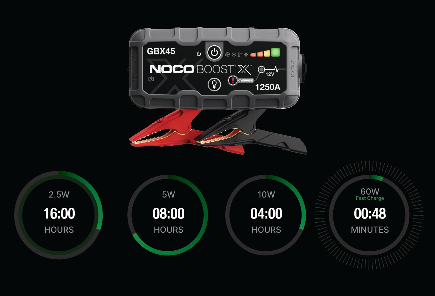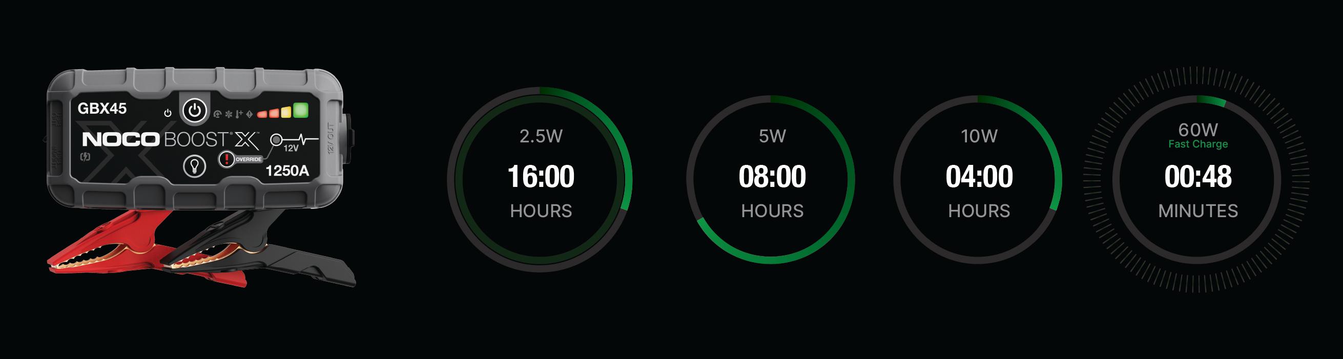Connect the GBX45 using the included USB-C Charge Cable to the USB-C IN/OUT port and a powered USB port, like an AC adapter, car charger, laptop and more. The USB-C IN/OUT port on Boost X utilizes Power Delivery 3.0 technology capable of receiving/delivering up to 60W. Due to FCC regulations, we do not recommend charging and discharging the unit at the same time. The time to recharge Boost X will differ based on the discharge level and the power source used. Actual results may vary due to battery conditions.