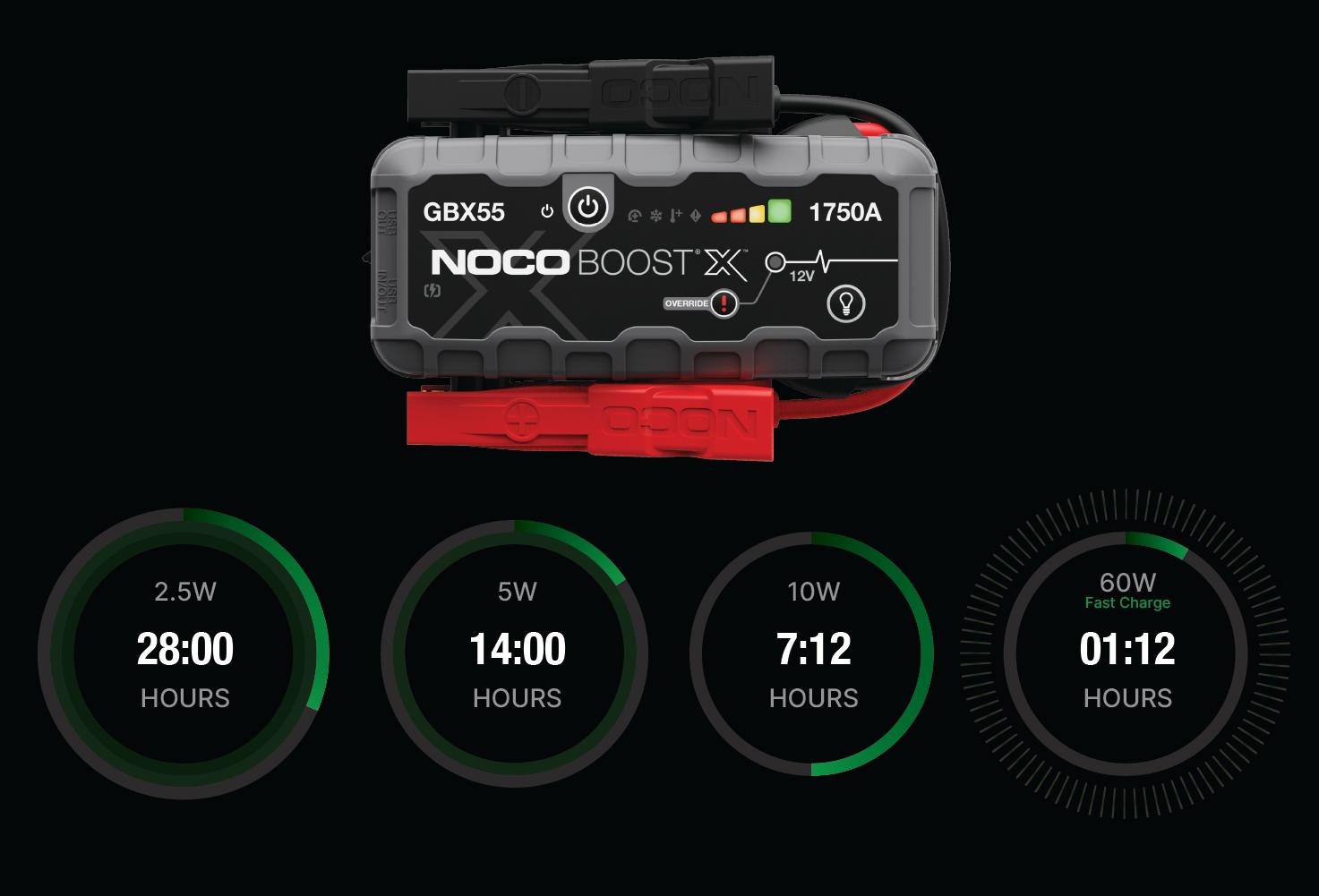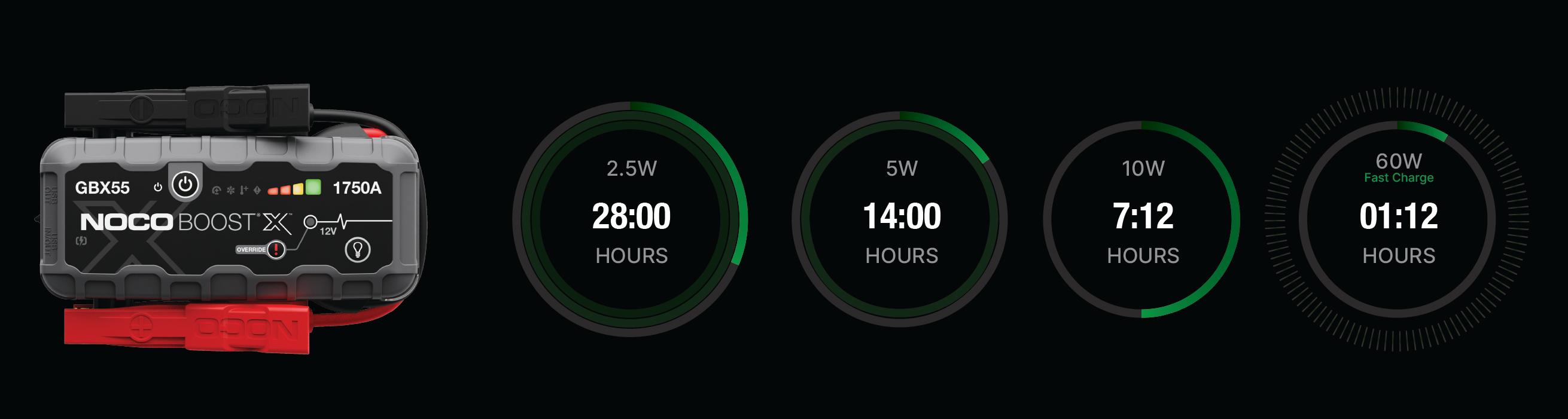 Connect the GBX55 using the included USB-C Charge Cable to the USB-C IN/OUT port and a powered USB port, like an AC adapter, car charger, laptop and more. The USB-C IN/OUT port on Boost X utilizes Power Delivery 3.0 technology capable of receiving/delivering up to 60W. Due to FCC regulations, we do not recommend charging and discharging the unit at the same time. The time to recharge Boost X will differ based on the discharge level and the power source used. Actual results may vary due to battery conditions.